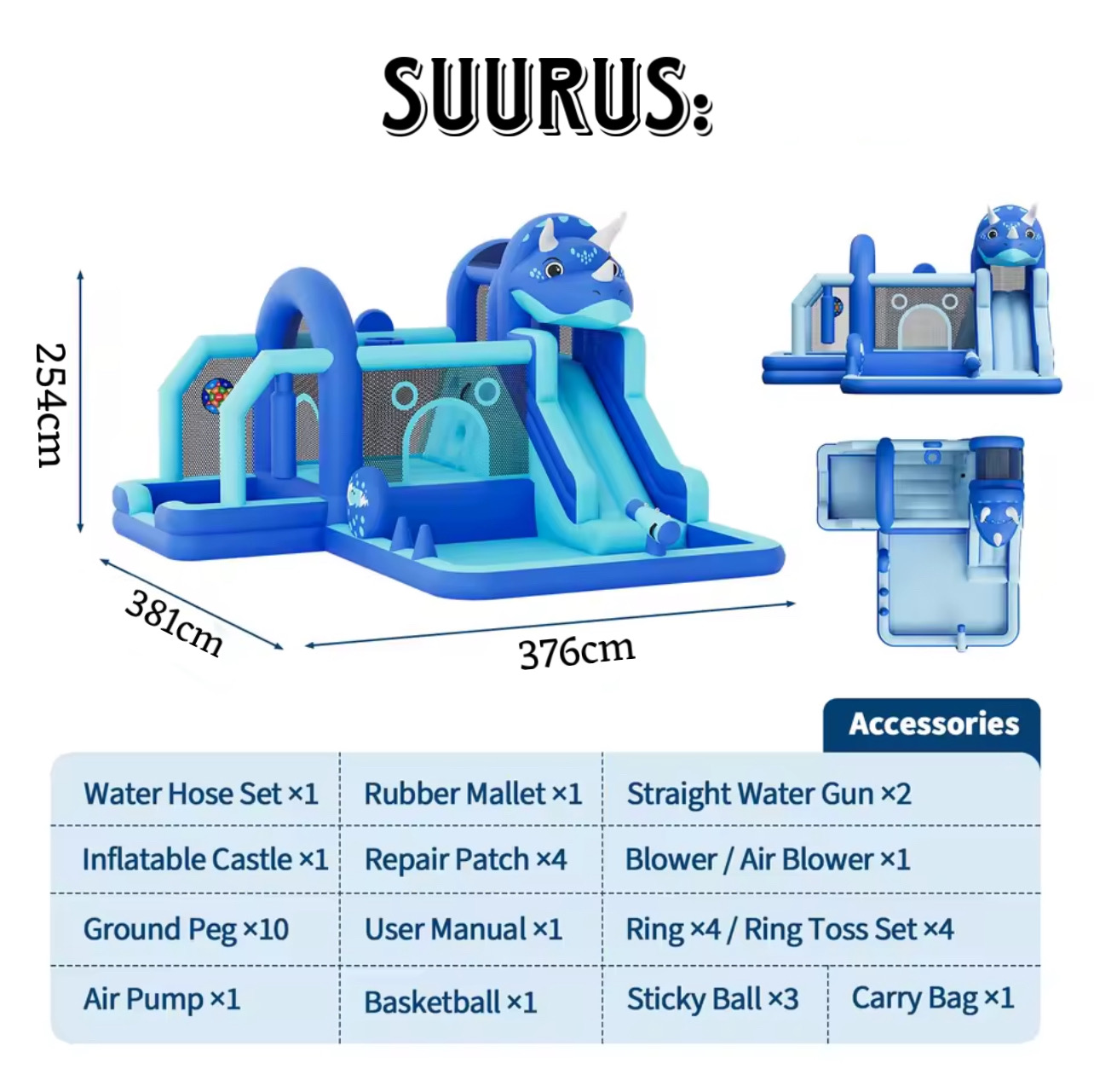 Dinosauruse batuut on sobilik lastele eelkõige 2-4aastat. Täitub kõigest 4minutiga ning väga lihtne üles seada ning kokku panna. Mahub kenasti sõiduautosse nii tahaistmele kui ka pagasnikusse.